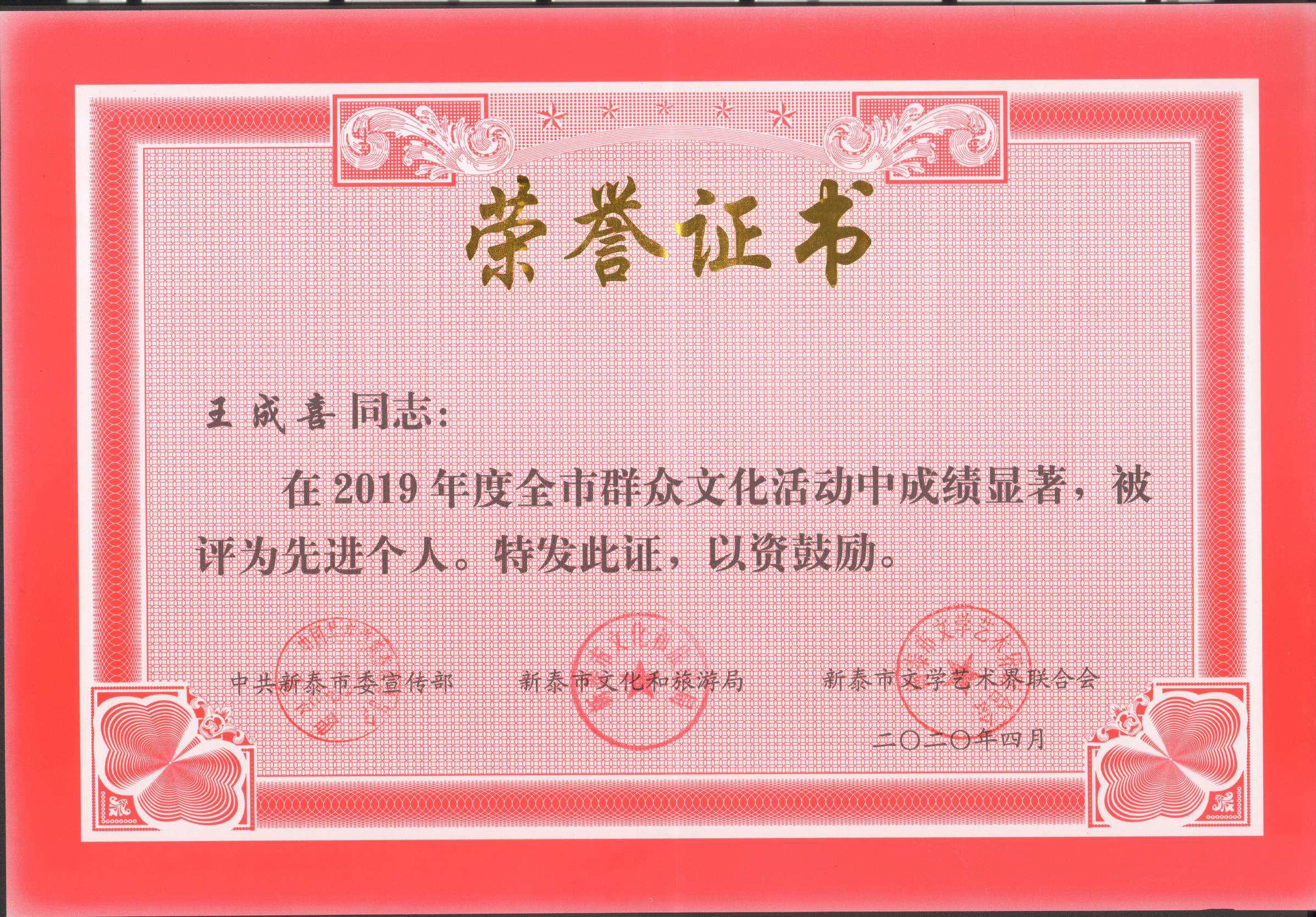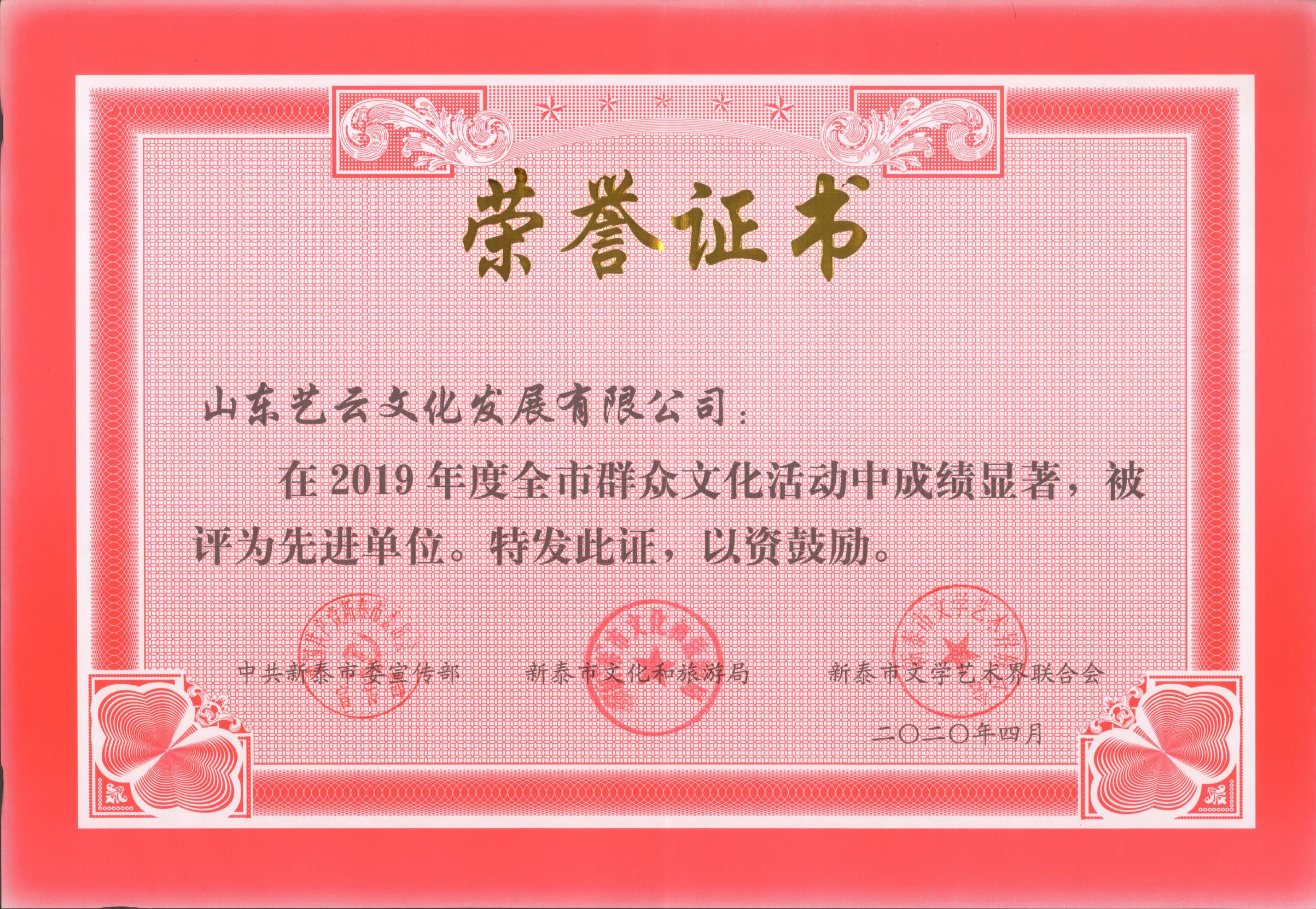 2020年4月,中共新泰市委宣傳部、新泰市文化和旅游局、新泰市文學(xué)藝術(shù)界聯(lián)合會聯(lián)合授予山東澤華集團(tuán)董事長、總經(jīng)理王成喜同志“2019年度全市群眾文化活動先進(jìn)個人”榮譽稱號;授予山東澤華集團(tuán)藝云文化發(fā)展有限公司“2019年度全市群眾文化活動先進(jìn)單位”榮譽稱號。