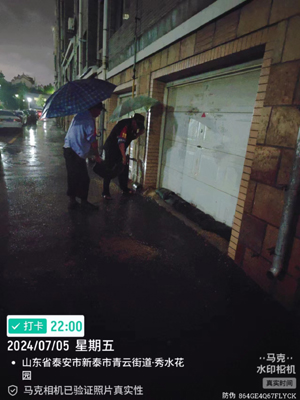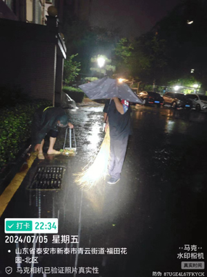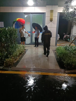 嚴(yán)陣以待巡查到位。7月5日夜間,強(qiáng)降雨持續(xù),物業(yè)公司各項目負(fù)責(zé)人堅守崗位,冒雨逆行,反復(fù)對小區(qū)內(nèi)車庫出入口、地下車庫、各排水口等重點部位逐一檢查,徐經(jīng)理親自到各項目(小區(qū))巡查,并對值班人員強(qiáng)調(diào)要隨時監(jiān)控暴雨動態(tài),切實做好24小時值守工作。巡查工作一直持續(xù)到6日凌晨,為廣大業(yè)主排除了安全隱患,展現(xiàn)了華通人關(guān)鍵時刻挺身而出的責(zé)任與擔(dān)當(dāng)。