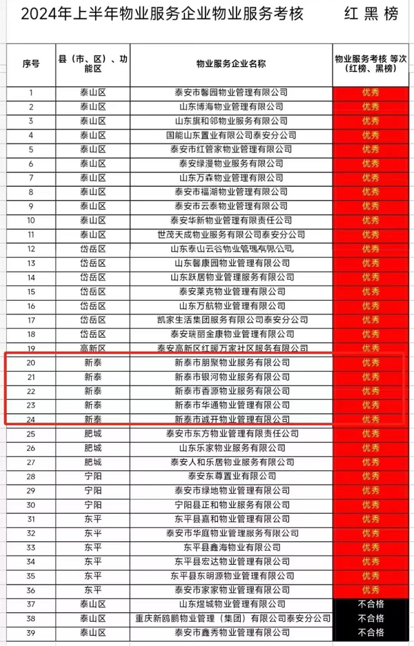 7月30日,泰安市房產(chǎn)管理服務(wù)中心發(fā)布泰安市2024年上半年物業(yè)服務(wù)企業(yè)物業(yè)服務(wù)考核紅黑榜,新泰市華通物業(yè)管理有限公司榮登紅榜,物業(yè)服務(wù)榮獲優(yōu)秀等級。