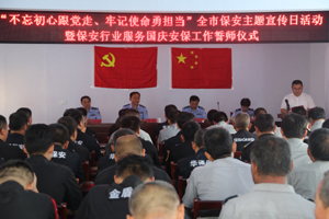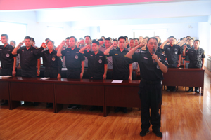 最后,在場全體保安人員面對黨旗、國旗就70周年國慶安保工作進(jìn)行宣誓。堅決服從命令、聽黨指揮、勇敢擔(dān)當(dāng)、不負(fù)重托、文明執(zhí)勤、嚴(yán)守紀(jì)律、不辱使命、恪盡職守,迎接一切挑戰(zhàn),戰(zhàn)勝一切困難,全力以赴,決戰(zhàn)決勝,堅決打贏安保維穩(wěn)攻堅戰(zhàn),全力投身建國七十周年安保任務(wù),為70周年建國大慶獻(xiàn)禮。(張遷)